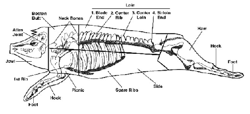 You can see the ribs attached to the spine directly under the loin, or the “backstrap”. Those are baby-back ribs.  A lot of people get confused there because they think “babyback” is the operative word, as if the back part is “baby” or from a young pig. Actually, it should read as “baby back-ribs”, meaning that those ribs are back ribs (i.e.-contain part of the spine) and are small (“baby”). Those are the most lean and the most expensive. The next portion of the rib bones (you if you follow along the rib secion) you get the spareribs. Those are the ones we are going to eat because they have a lot of connective tissue and take smoke really well. For the record, the last part is the countrystyle ribs, which are really meaty and cut across the bone instead of with the bone. The layer of meat that lays directly on top of the country-style ribs is the part of the pork that they cut for bacon, which is the “pork belly”.