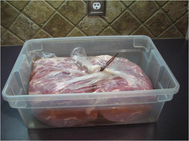 The chunks of pork are loaded into large tubs, which are stored in a refrigerated storage container, retrofit with a large air conditioner.