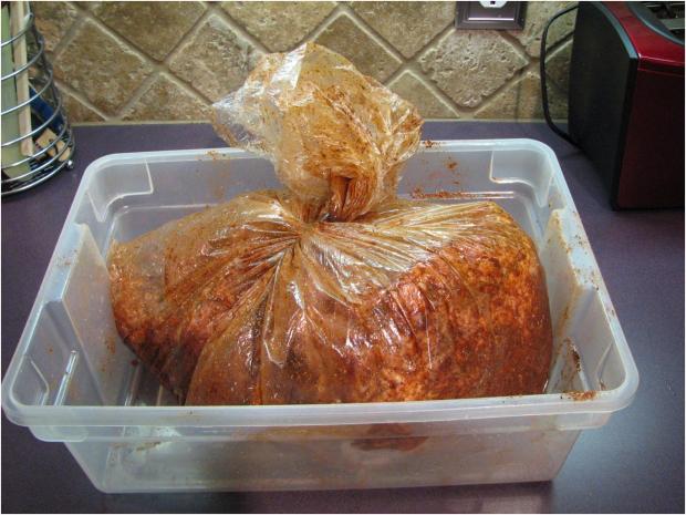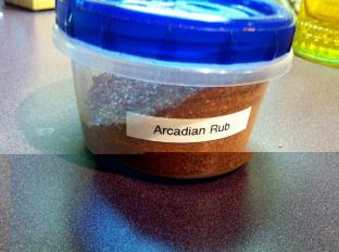 Using the Arcadian BBQ rub, liberally coat these things down on all sides and any cracks and crevices you can find. Then, put it back into the bag and close it back up. It needs another night to get seasoned up.