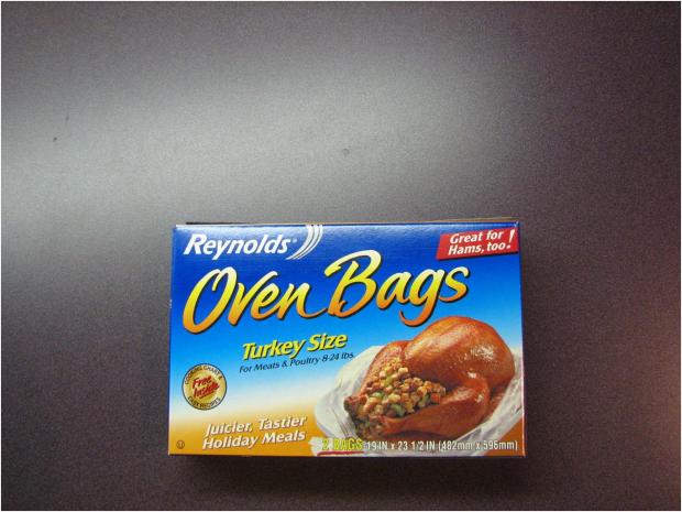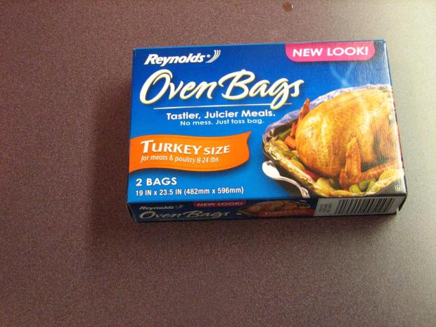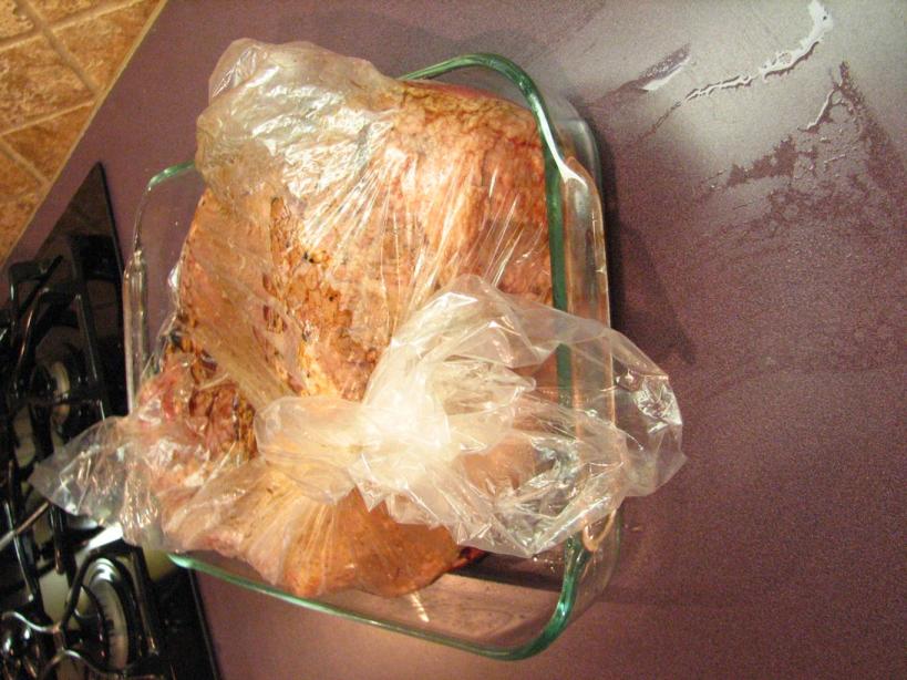 That’s an eight-pounder, which is about the average of what you’ll find. On occasion you’ll run across one a little bigger or smaller, but for the most part that’s what you’ll get when you buy one. First thing’s first….take it out of the package and rinse it under water. Be careful…there are a couple different muscles here, so it may try to fall apart on you. When you get it rinsed off and set aside, let’s get the bag out. I like to use a turkey bag. Reynold’s makes a perfect product for this: