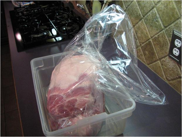 Into the fridge it goes for the night. The next day, take it out of the fridge, unfastened the closure and pour as much of the liquid out as possible. We are going to use a dry rub on this, so you want to make sure you get as much liquid out as possible. No reason to save the brine…it’s done it’s job, and we’ll have ample liquid from the drippings from this after it’s cooked.