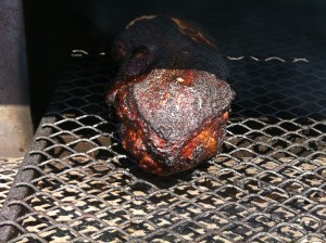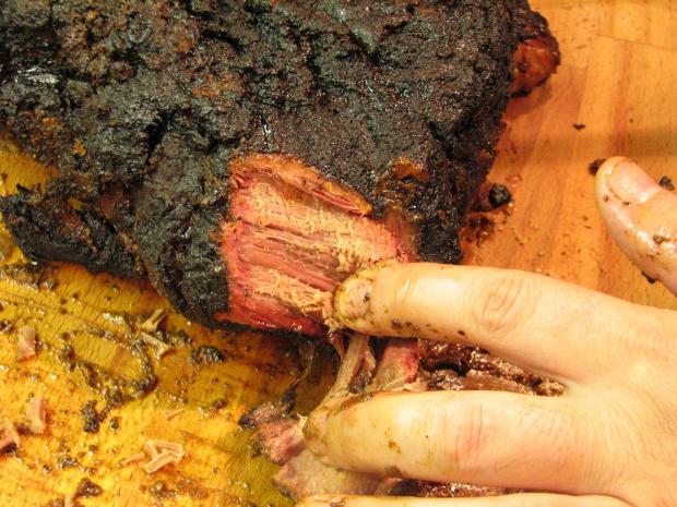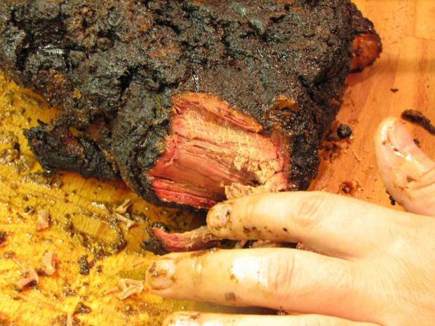 After 3-4 hours, you should have a nice bark around the edges (but not scorched) and a nice red-brown color to the meat.