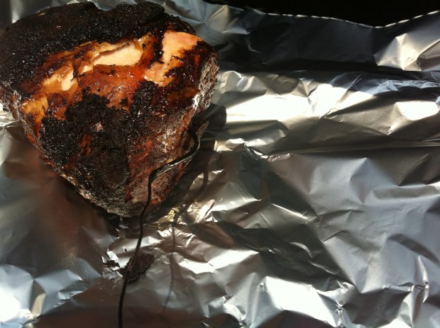 After you’ve put all the smoke you want on it, take your digital probe thermometer and stick it into the opposite end of the shoulder blade bone longways and push it in as far as it will go. Then wrap the roast in foil VERY well. That is, lay down the foil with the shiny side down and lay the roast on it.