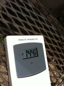 …and then hung in the refrigerated storage container to cure for a couple days before it’s cooked.  The sausage is hung on 1″x1″ boards that run the width of the container.