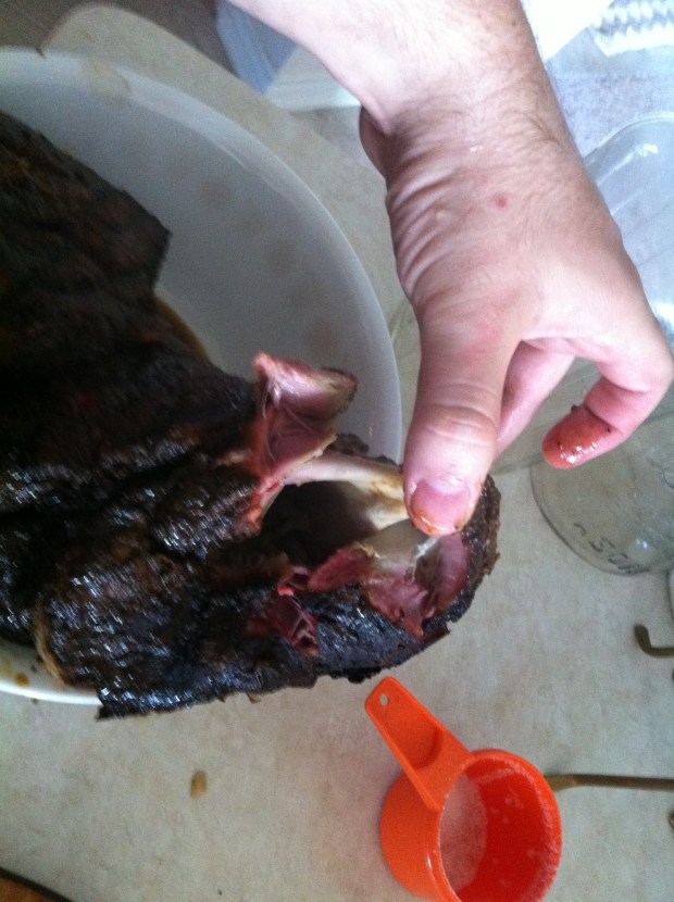 At some point, you’ll need to CAREFULLY unwrap the rack just enough to get access to the bone so you can do your jiggle test.  If you spill any of that juice, I swear to you I’ll come to your house and cut your hair at the scalp with my pocketknife.  DON’T do it.