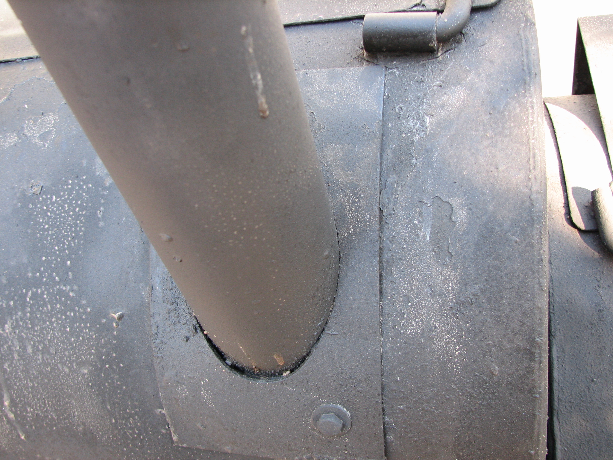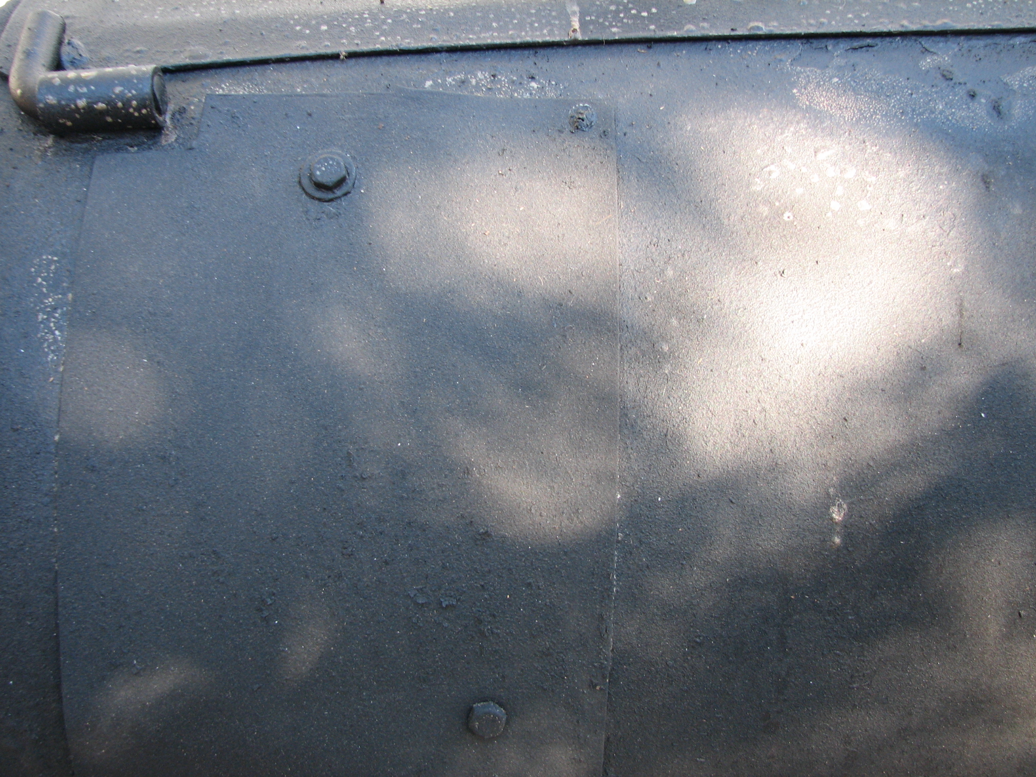 Now, I need to seal up the original chimeny hole.  I just took another piece of sheet metal and cut it into halves, putting one section on the outside and one on the inside, making sure they covered the hole completely.  Using the same bolt holes as before, I bolted the sheets on.