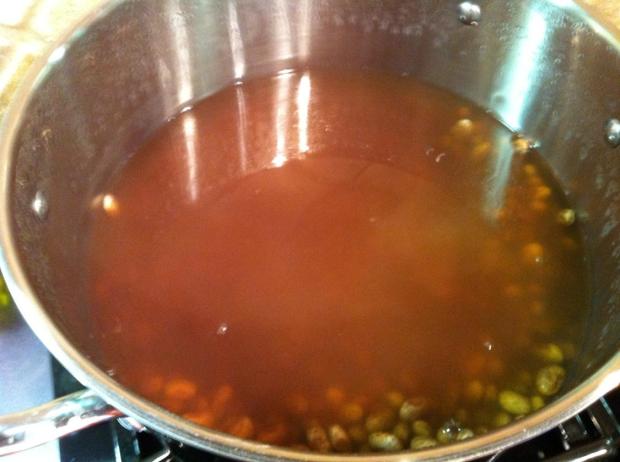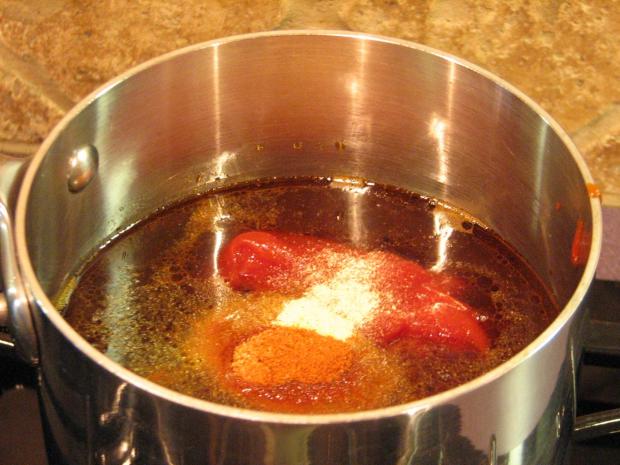 Pour the liquid into a sauce pan. Add 2c of ketchup.