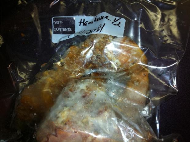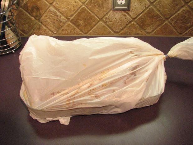 Now, we need to put this back into the fridge overnight. Don’t skimp. Needs to be overnight. If you put it in unwrapped, though, your fridge is going to smell like this for weeks, so grab a new trashbag (unscented) and put the whole thing in, pan and all. Seal it up and let it sit in the cold.