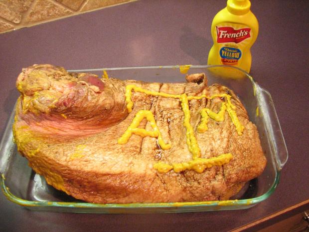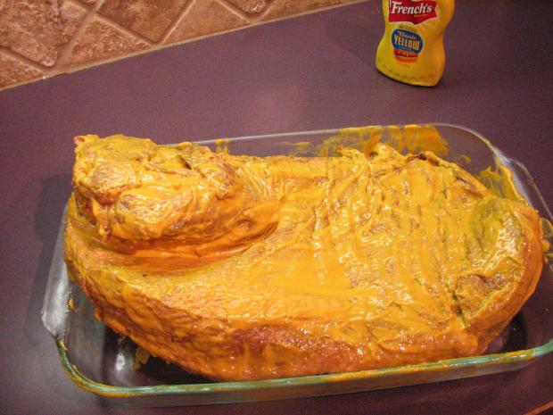 Get your yellow mustard out and squeeze LIBERALLY all over this thing, and then smear it with your hands so that it’s thick all the way around. Go ahead and rub it in kinda hard into the cracks and crevices where you can get your fingers. I always start mine out right: