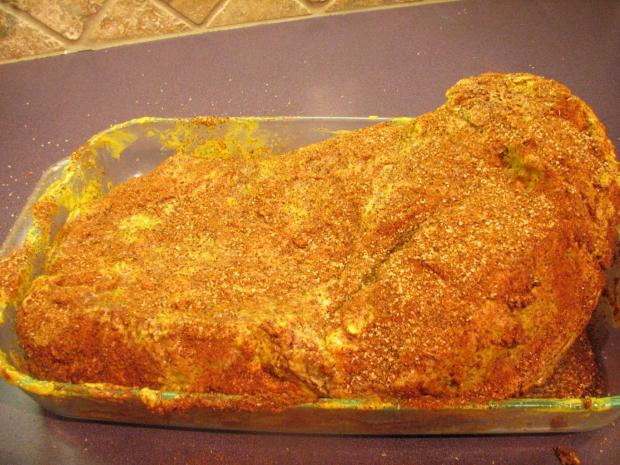 Flip it over and get the other side as well (fat cap back down). DON’T RUB IT. Just sprinkle on top of the mustard. If you’ve disturbed the mustard coating, make sure it’s even and then re-sprinkle to cover.