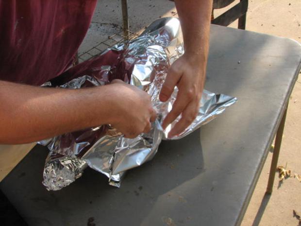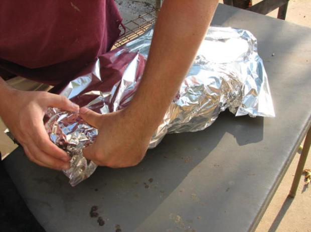 At this point, go ahead and wrap it up with heavy duty foil.  Wrap it twice and make sure the juices can’t drip out.