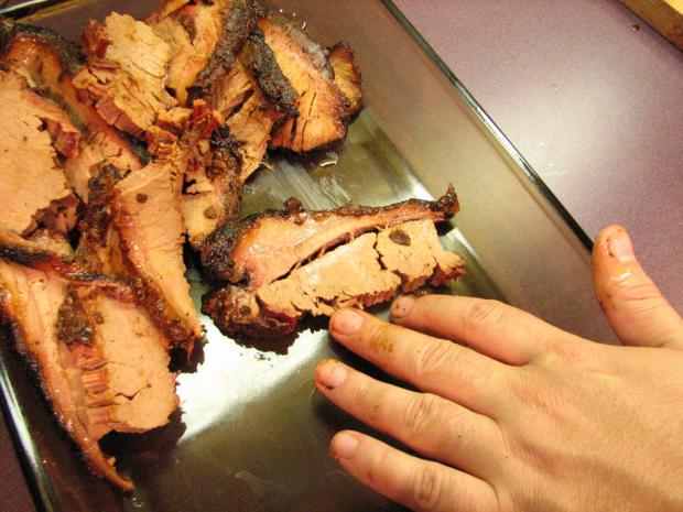 Ranchers would just toss this thing because it was so hard to cook. There’s an entire cap of fat on one side, and all three muscles are separated by  layers of fat and membranes that are really deep and hard to get to before it’s cooked. Even then, you can easily mess up the presentation by cutting it wrong. The direction of the cut is almost as important as how it’s cooked. About 50 years ago, though, ranchers started noticing that their Mexican hands were taking the briskets and making incredible dishes with them. They figured out that what they were doing was cooking it over low heat for a long time in a braise. They took the braised meat and cooked it over dry heat, and the modern Texas BBQ was born.