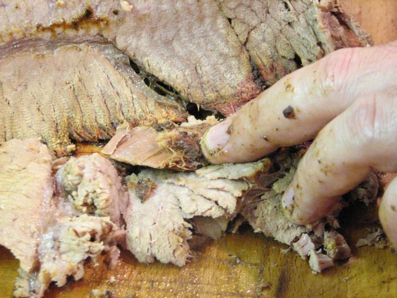 The brisket is the cut just above the front legs. Think of it as your chest if you were to get down on all fours. Because of where it is, more than half of the entire body weight of the animal sits on this piece of meat. Therefore, it has to be strong, long meat fibers that are filled with fat and connective tissue. In addition, there are three different muscles that come in, and therefore three different meat fiber directions. This makes things really difficult to manage, especially when it comes to cutting the finished roast.