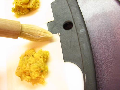 A dollop ...Brush with water to seal the top and bottom of the wonton togethe.