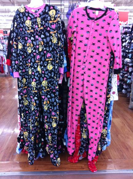 Adult-sized footed pajamas. A seriously bad idea. Tweedy Bird print or Jolly Roger in pink? Yep. Look closely. That’s a skull and crossbones design on pink fleece. That’s awesome. Does anyone ask for this?