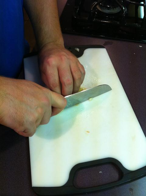 The very first thing you do after inventory assessment is to sterilize everything. Even if you’ve washed and cleaned everything with hot water and soap, there still may be some bacteria floating around, and even the smallest amount of bacteria can turn the beer bad fast. We mixed 2 tablespoons of regular bleach with hot water in the primary fermenting bucket and shoved everything in there that we could…corks, burper, probe thermometer, metal whisk…anything we thought we might use at any point after the boil phase, we sterilized.