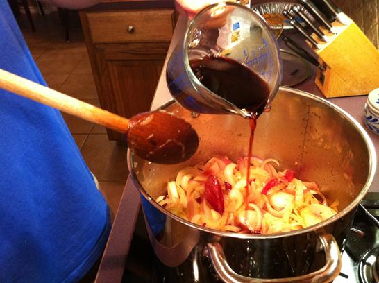 The pour in the malt syrup. It’s so thick that you have to immediately start stirring it up or it will stick to the bottom of the pot. Why do I know this? you might inquire? Later.