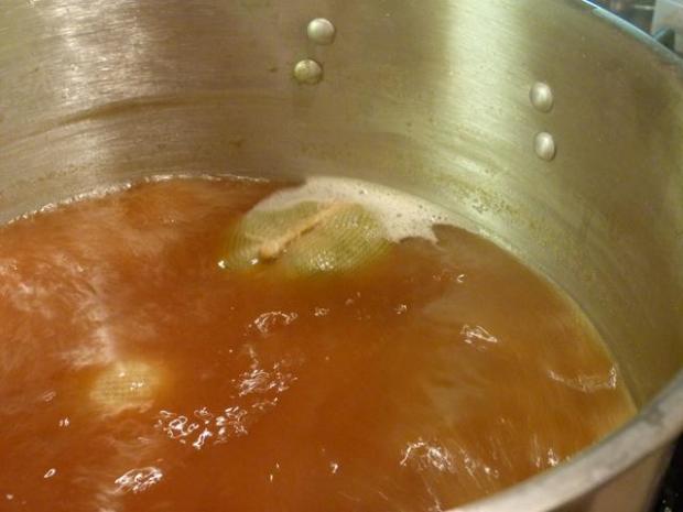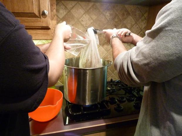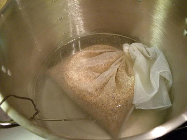 That has to simmer at 153 degrees F for 20 minutes. Why so precise? The whole grains have a lot of sugars and resins deep inside their kernels that will be really bitter if they are extracted, so if you keep the heat down they will not seep out. In addition, you CANNOT squeeze the bag they are in AT ALL or you’ll squeeze them out.