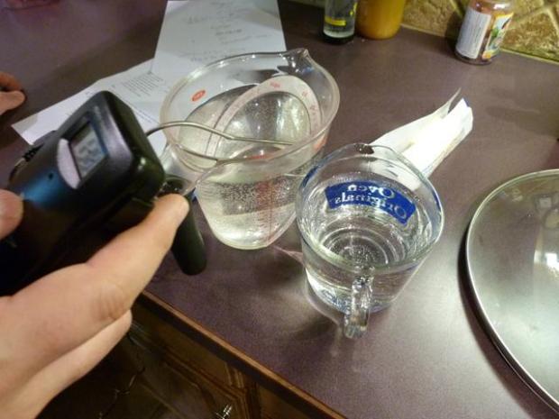 We have to let this cool off to somewhere between 65-75 degrees before we “pitch” the packet of dry yeast. If it’s too hot, then the yeast will immediately die. If it’s too cold, the yeast could die or just be arrested and not bloom.