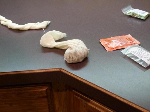 We’ll put those into a cheesecloth sock, darned at one end and tied off at the other end. The pellets will swell up and expand pretty big as they cook, so we need to give them plenty of room to grow.