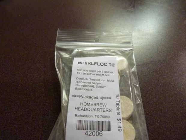 After 60 minutes of boiling on the flavoring fuggles hops, we need to add whirlfloc. Whirlfloc is a synthetic additive that doesn’t affect the smell, taste, or flavor of the beer at all. What it does is grab on to all the suspended particles in the beer and make them heavy enough to sink to the bottom of the primary fermenting bucket. If we were making a dark beer, then this isn’t an issue. However, with a lighter golden beer then we are probably going to see particles in the beer if we don’t filter it. Since we don’t want to filter, we use whirlfloc. Purists will use Irish Moss, but we’ll just use whirlfloc for ease of use.