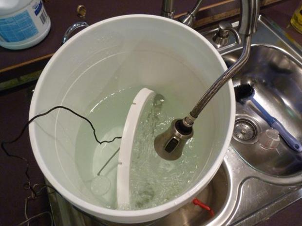 Topping off with another gallon of water to make five gallons total in the fermenter (
