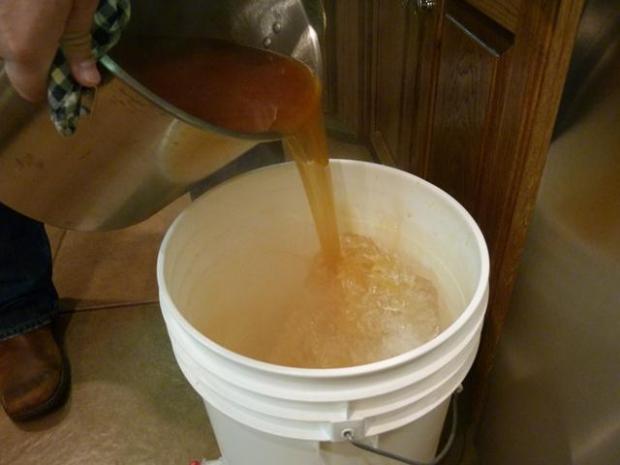 We let this cool down for 15 minutes in the pot. Then, we took 8lbs of ice and put it into the sterilized primary fermenting bucket with the spigot turned off so it doesn’t run all over the floor.