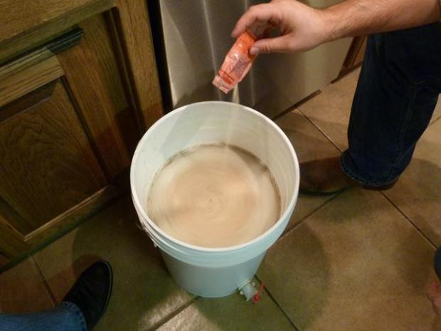 “Pitching” the yeast into the top of the bucket: