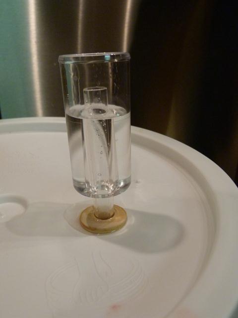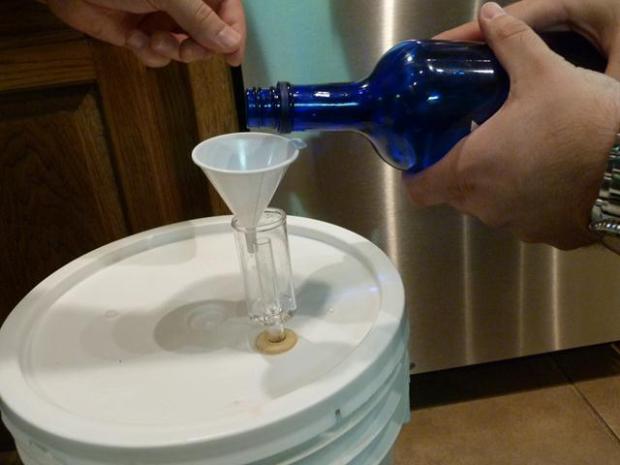 Alton Brown tells us to add water into the airlock to make bubbles, but the gearheads go one step further. If you use vodka in the airlock instead of water, then it keeps it extra disinfected. It just so happens that I keep vodka laying around for just such an occasion.