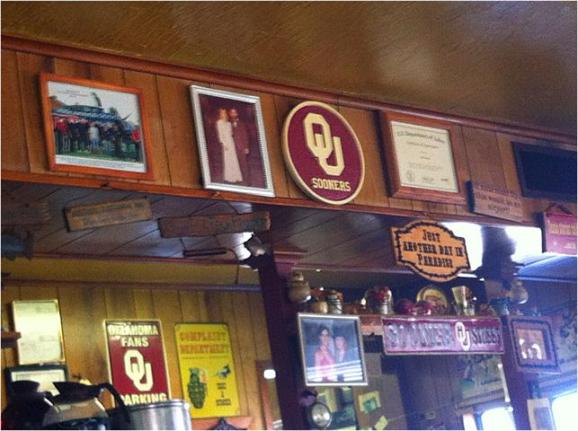 Above the front desk, you’ll see Bob’s wedding photo and his prized Sooner gear. He lets Aggies, Raiders, and Longhorns eat there, but he’ll make sure you remember who won the most recent game.