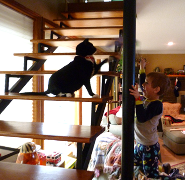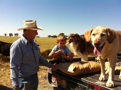 This is what The Arcadian Experience is all about: my dad and my son feeding cattle with the dogs. Jdubs is in his undies.